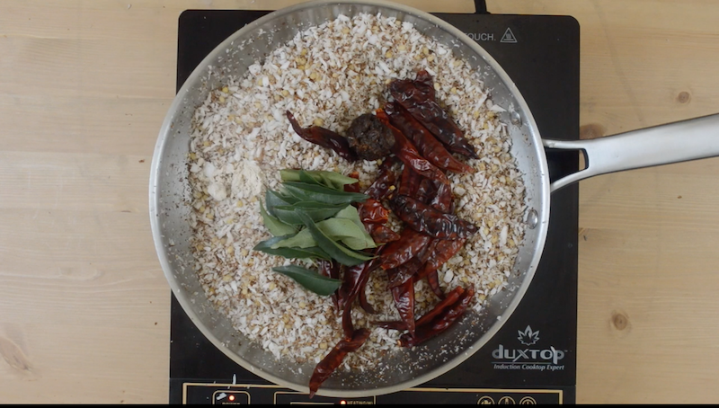 - Heat a pan and add freshly grated coconut. Add urad dal and roast them together till they are light brown color