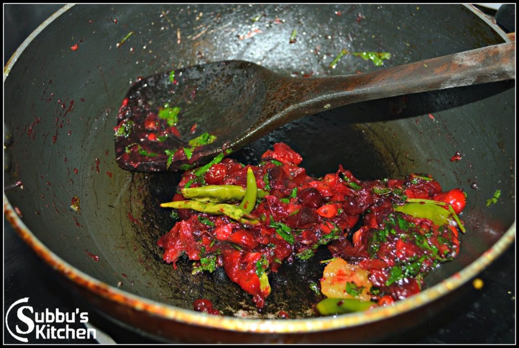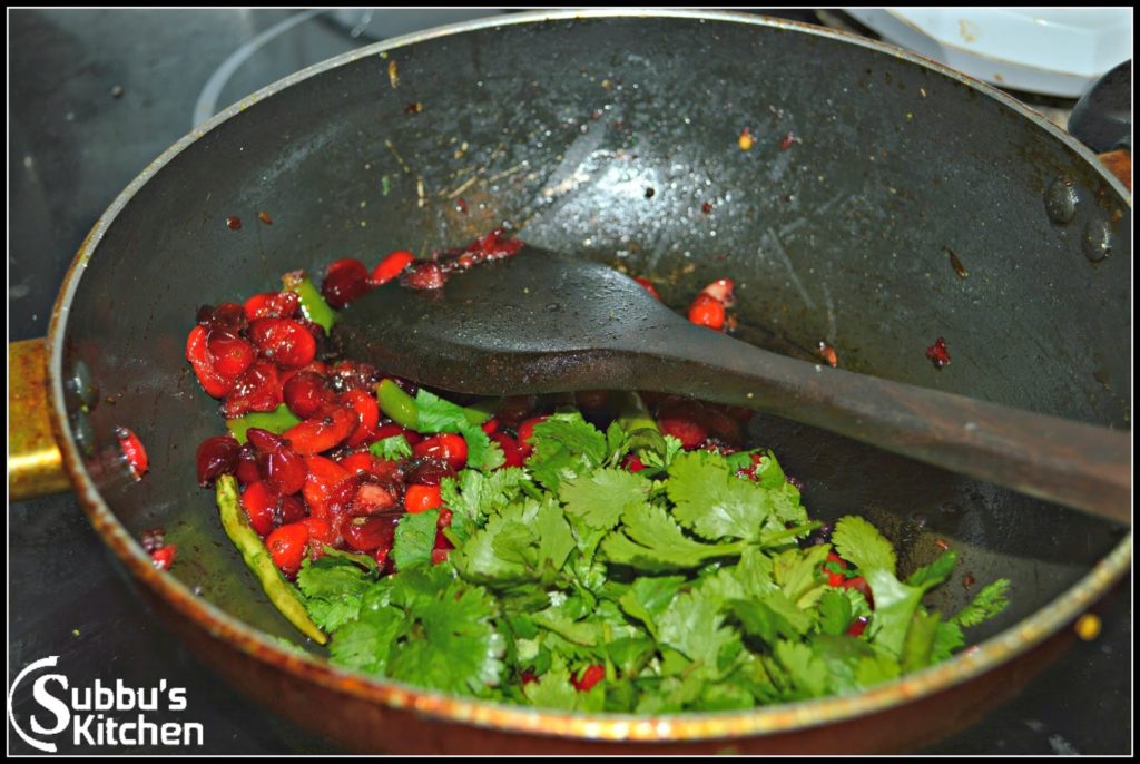 - Finally add chopped coriander leaves and and allow the cranberries to cook completely and becomes mushy and remove from flame. Allow the contents to cool off and then grind it to a nice paste. Season the chutney with mustard seeds