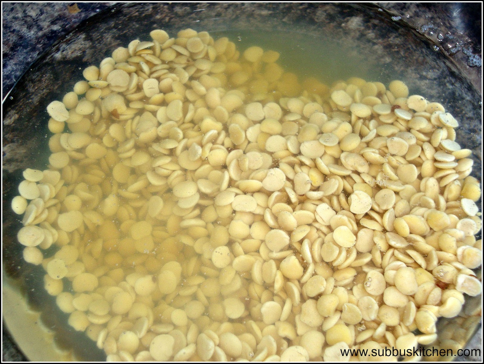 - After 2 hours, wash the dal again and drain the water. Add 2 cups of fresh water. Along with this add turmeric, chopped green chillies, grated ginger and garlic. Add necessary salt and pressure cook the dal. Allow for 4 to 5 whistles to cook the dal nicely so that if we mix the dal with spatula/ladle, it should be smashed completely