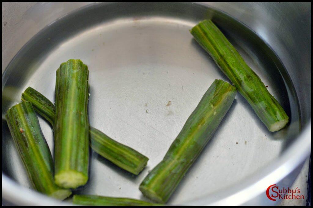Pressure cook half of the drumstick pieces (about 7-8) along with toor dal over 3-4 whistles.