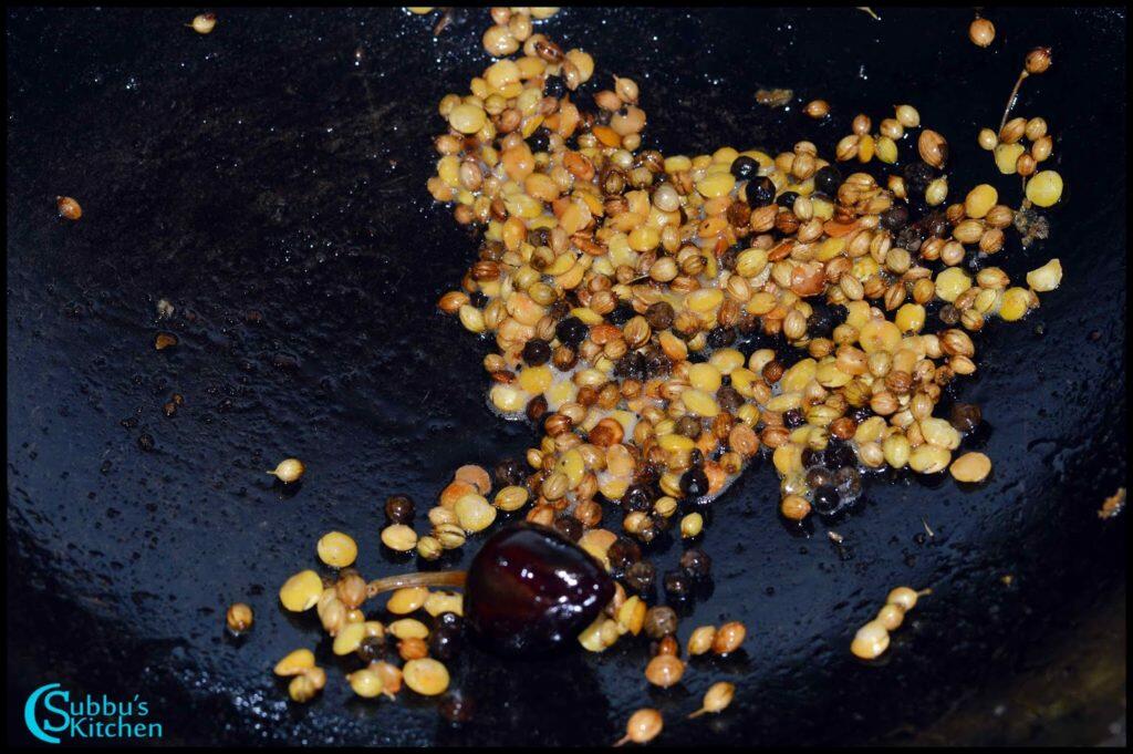 - Heat a pan, add ghee and add the grinding ingredients (Toor dal, Coriander seeds, Red Chili, Peppercorns) except cumin seeds and fry it till the dal turns golden brown color. Remove the fried ingredients from flame and add it to mixer and also add cumin seeds