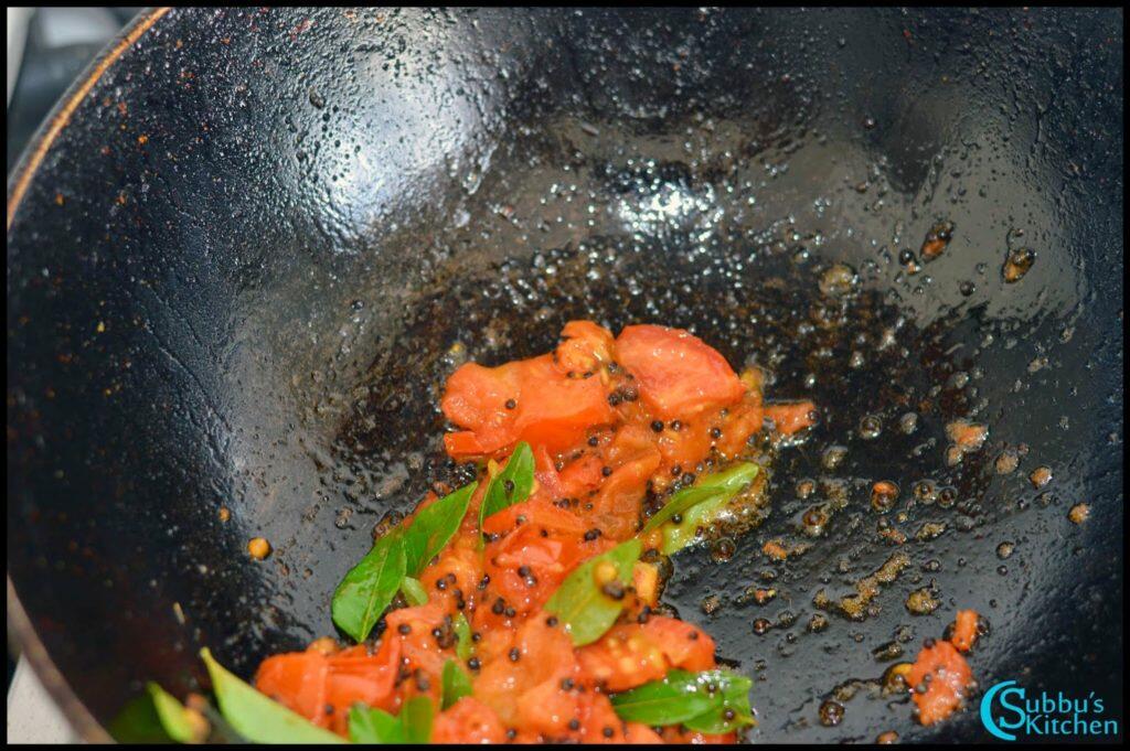 - Heat another pan, add ghee and add mustard seeds and when the mustard seeds starts to sputter, add curry leaves and chopped tomatoes and saute the tomatoes till they are cooked and then add it to the rasam.
