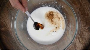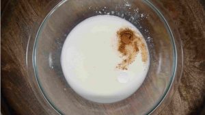 - In a mixing bowl, add milk, corn starch, sugar, cinnamon and vanilla essence.