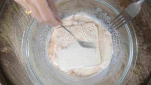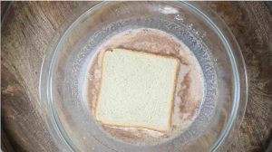 - Take a bread and dip it gently in the milk mixture. Flip and dip on other side.