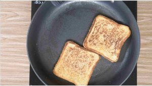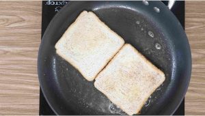 - Place this dipped bread on the butter greased hot pan. Let it get toasted on one side for atleast 30-40 secs and then flip it and cook till its golden brown and crispy
