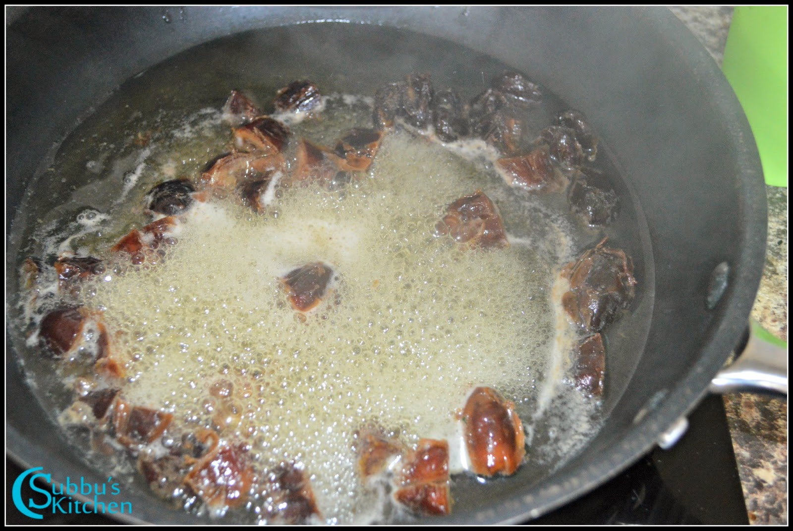 - Add dates to a pan along with ½ cup of water and boil till they become tender.
