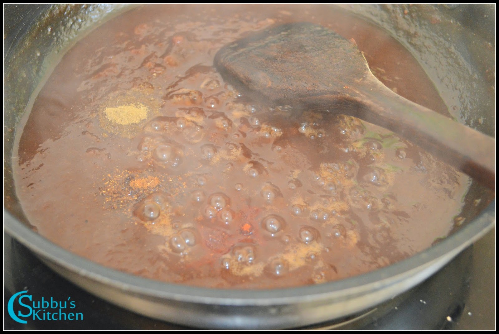 - Heat a pan and add the tamarind juice and allow it to boil for 5 minutes to get rid off the raw smell. Then add grated jaggery and allow the jaggery to get dissolved in tamarind juice.