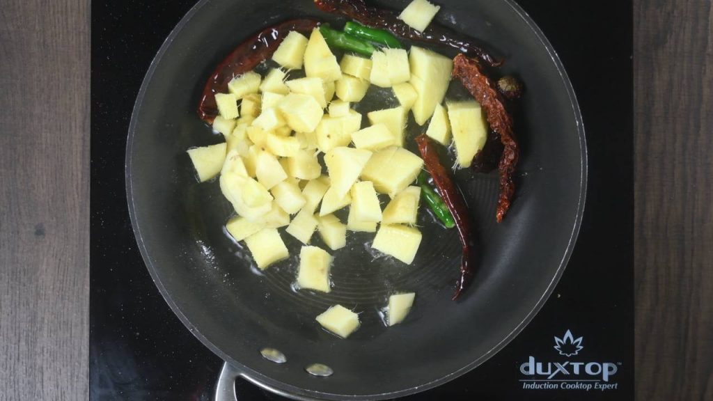 - Heat 2 tablespoon Sesame oil in a pan. Add green chili, red chili and ginger to the pan. Saute the ginger for 2-3 mins.