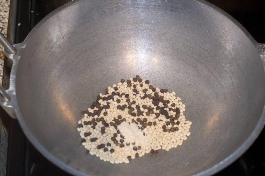 - Heat ghee in a heavy bottomed pan. Add urad dal, pepper, hing to the pan.