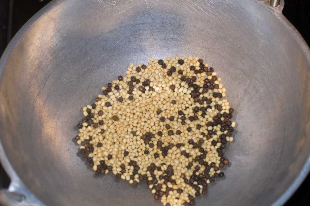 - Fry the ingredients till dal becomes light brown. Allow the fried ingredients to cool off completely.