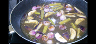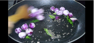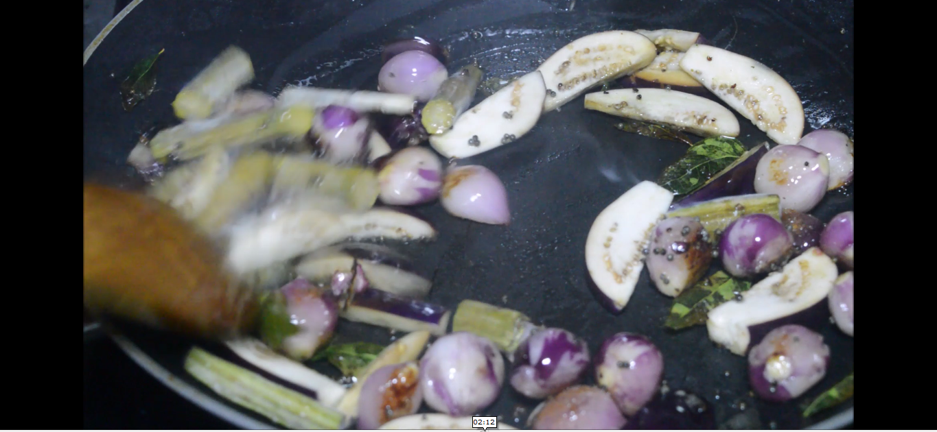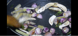- Add shallots and fry in oil till they turn transparent. Then add the chopped brinjal and drumstick pieces and stir-fry in high flame for couple of minutes
