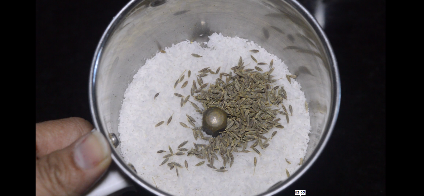 - While this is getting done, lets take cumin seeds, grated coconut and grind it to a smooth paste by adding little water.