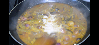 - Then add tamarind extract along with sambar powder and salt and allow the mixture to boil the veggies are nicely cooked and the raw smell of tamarind goes off