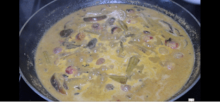 - When the veggies are cooked, add the cooked karamani along with cumin-coconut paste and stir well. Allow the kuzhambu to boil for 5 minutes in medium flame and then switch off the flame