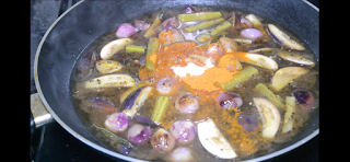 - Add ½ cup of water and allow brinjal and drumstick pieces cook. Also add Salt and Turmeric powder. The vegetables may take about 5 minutes to cook.
