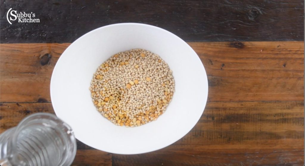 - Take the parboiled rice, chana dal, urad dal in a vessel.