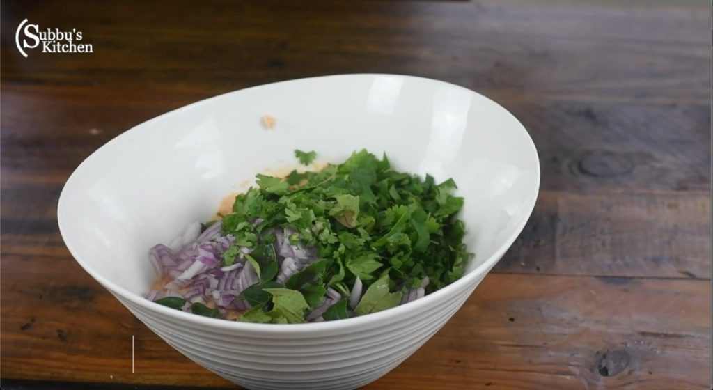 - To the ground vada batter, add salt, chopped onions, chopped coriander leaves and curry leaves.