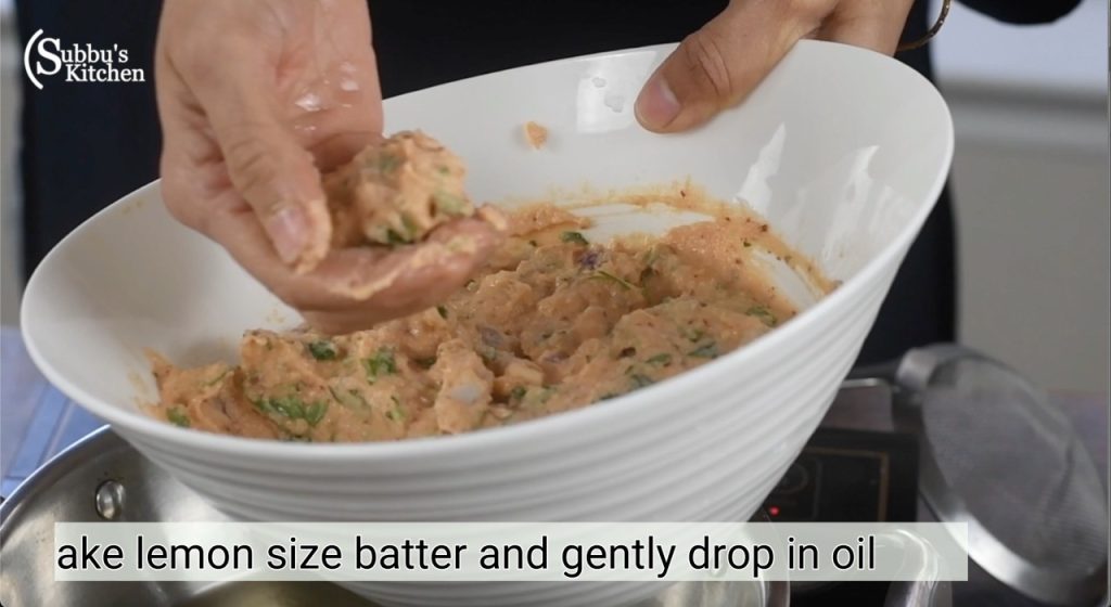 - Wet your fingers and palm with water. Take lemon size batte and gently drop in hot oil. Wet palms are easier to take the batter without sticking to the fingers.