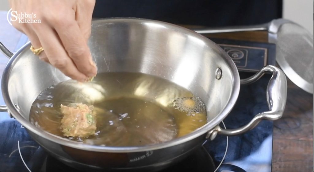 - Gently drop in hot oil. Wet palms are easier to take the batter without sticking to the fingers.