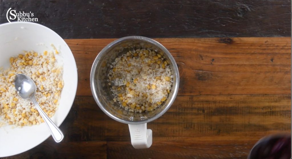 - Then, add the rest of the soaked dal+rice to the mixer jar. Add water little by little and grind it to thick batter.