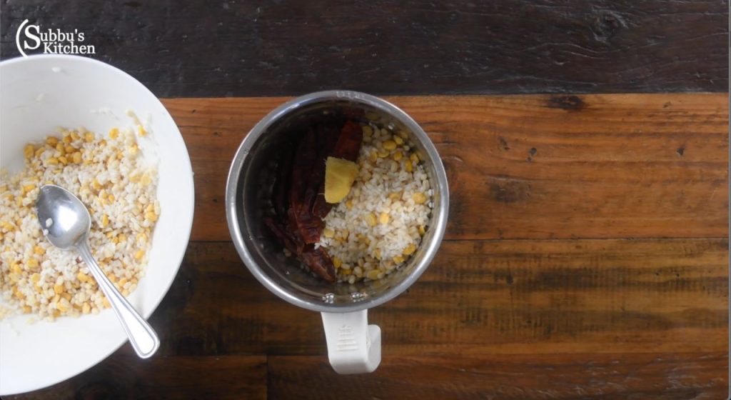- First grind only half of the soaked dal+rice along with red chili and ginger to ensure the chili is ground smoothly. Then add the rest of dal+rice.