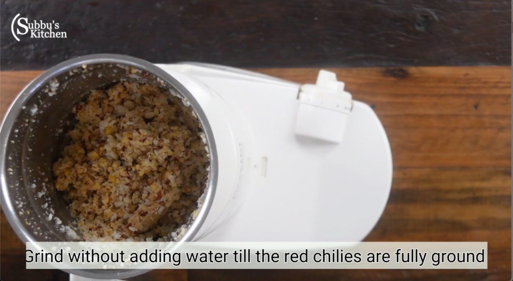 - Close the mixer jar and grind it without adding water till the red chili is fully ground.