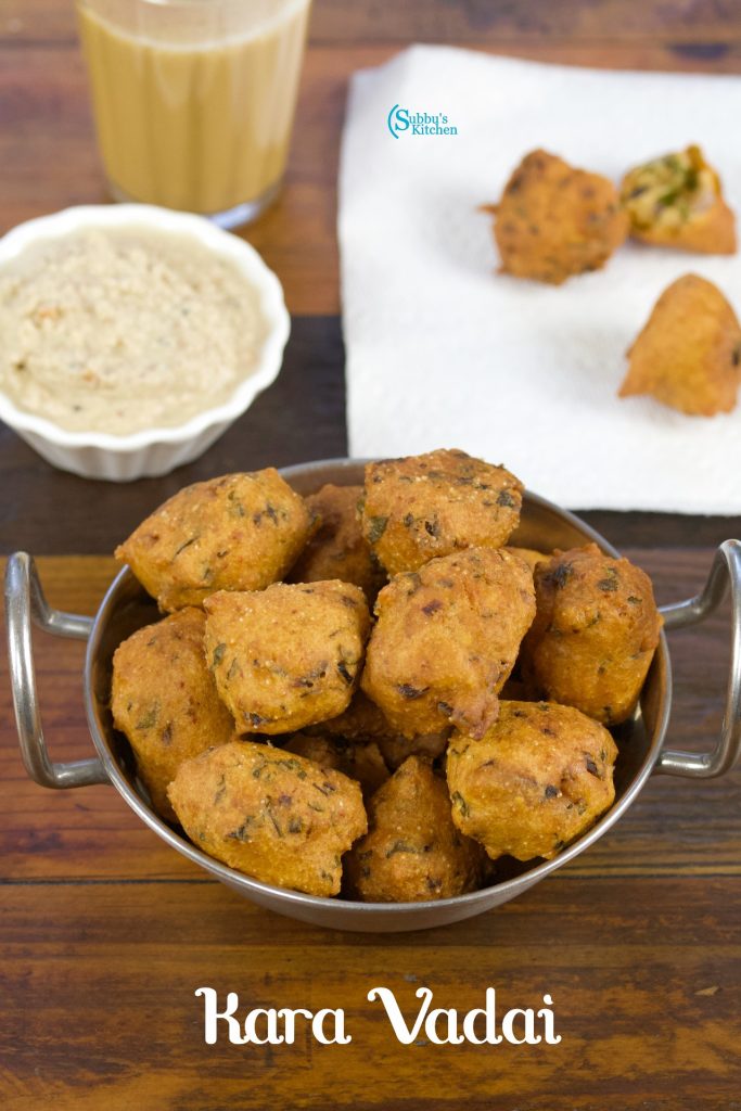 Kara Vadai is a tasty fritter which you can commonly find in Nagercoil / Trivendrum city. It's made using the dough prepared from rice, dals and are flavored with green chillies, coriander leaves, ginger and onions. An excellent evening snack and can be served with hot coffee / tea.