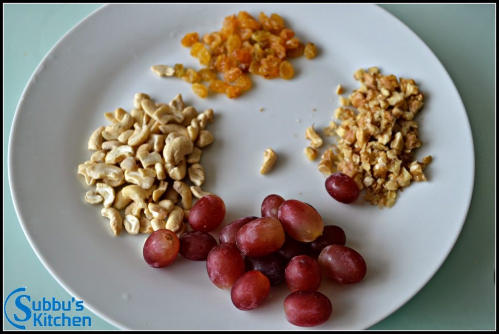 - Wash and Soak the basmati rice in water for 10-15 mins. Wash and dry the fresh red grapes and take all the nuts and keep it ready.