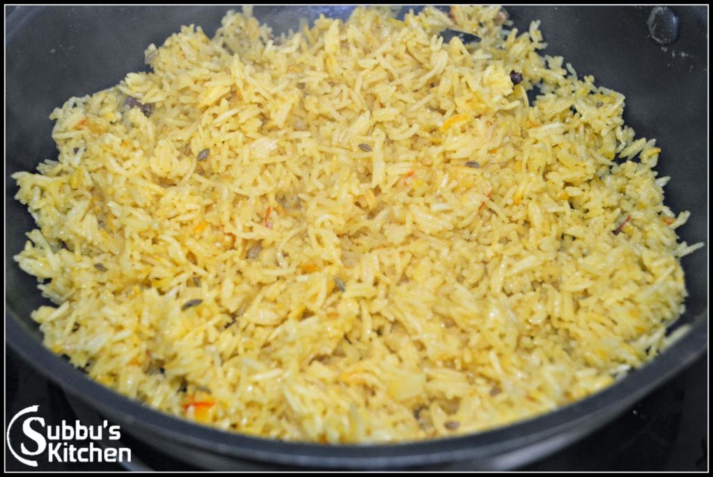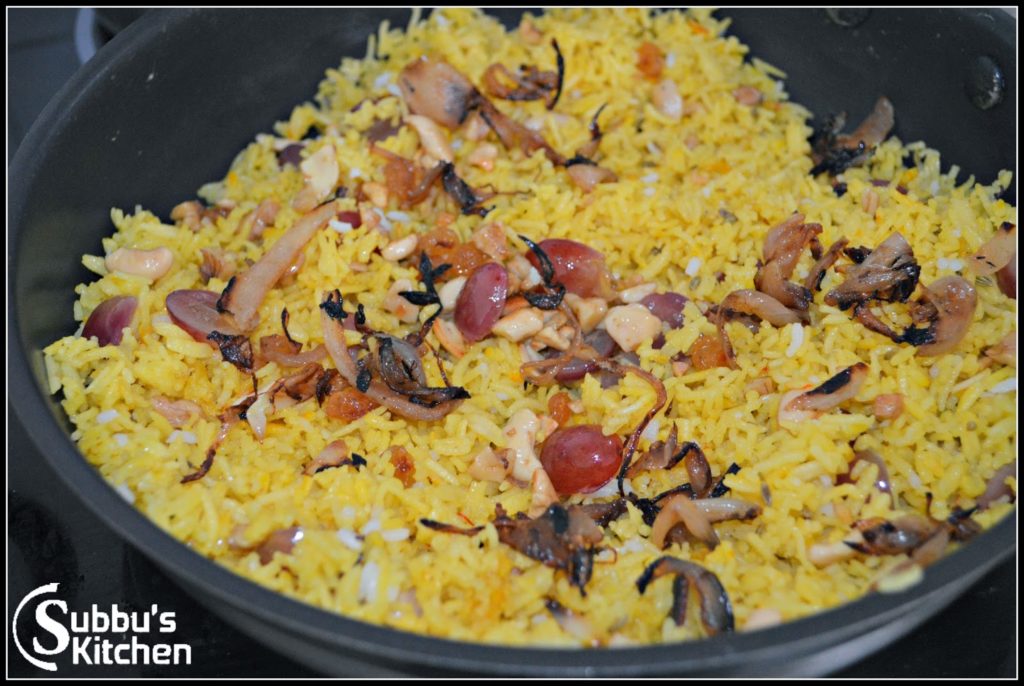 - Now we have got nice and fluffy rice. Finally we need to garnish with sauted onions and nuts and give a good toss