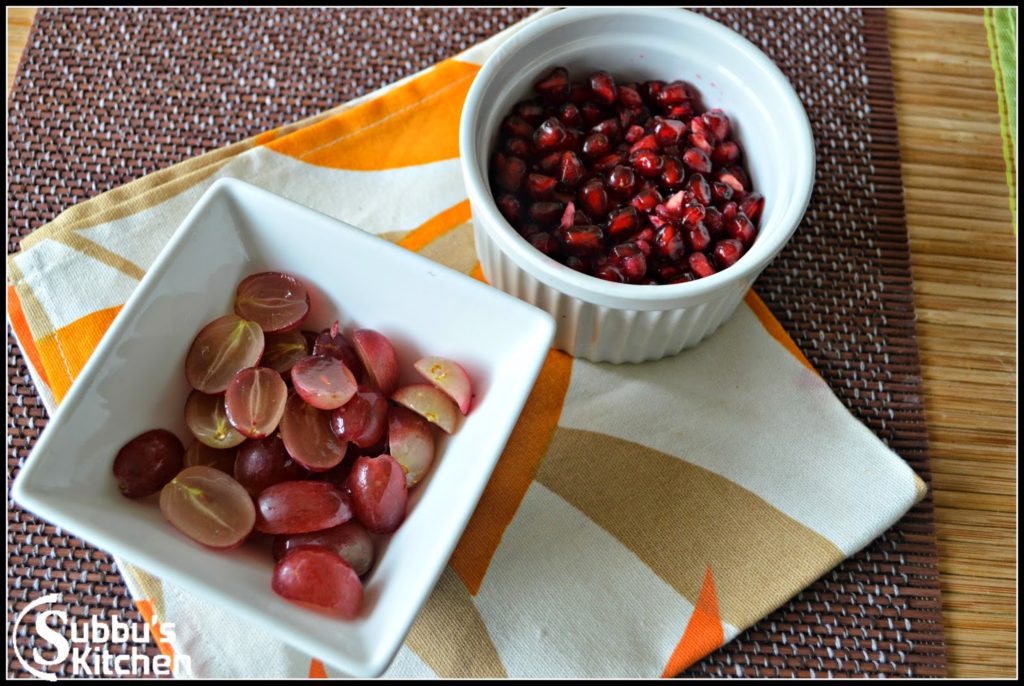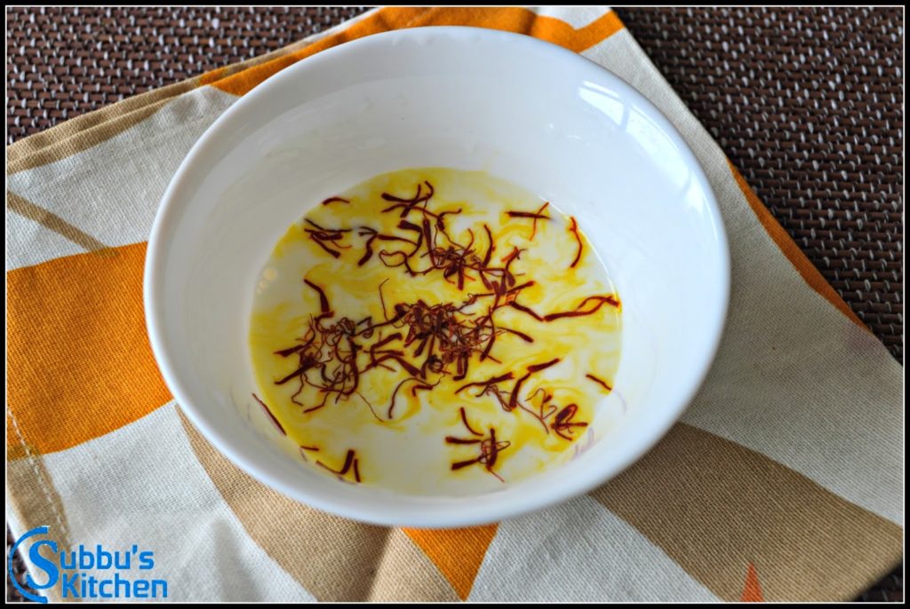 - Chop the grapes into 2 pieces and remove the Seed. Remove the pomegranate seeds and keep it ready. This we are going to use it for garnishing. Meanwhile, soak the saffron threads in milk and keep it aside. I have used more saffron threads and hence the dark yellow colour, but you could use 2-3 threads if you prefer to get a white or slightly saffron color