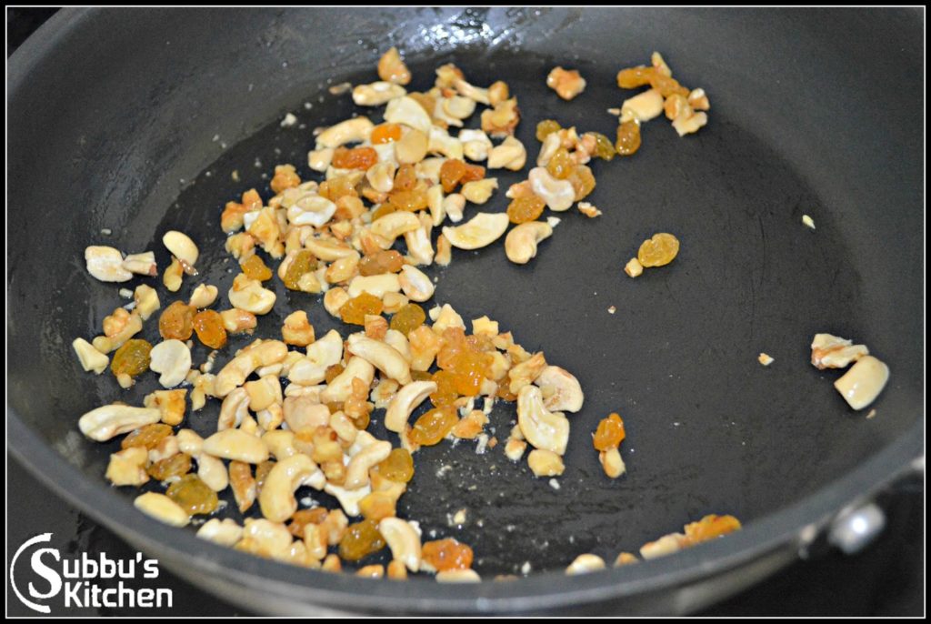 - Heat little ghee in a pan and add chopped onions and saute them till they turn golden brown color. Take this aside in a plate. Heat some more ghee and add the cashews, walnuts and raisins and saute them till the cashews turn golden brown color.