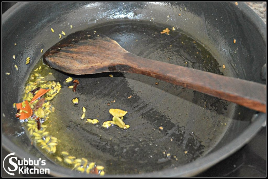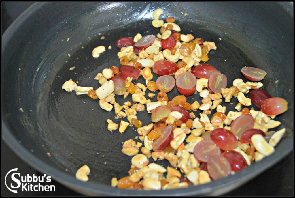 - Next we are going to add chopped grapes. We could even add chopped apples also. Saute the grapes for a minute and take all these in a plate. Heat more ghee in the pan and add the whole masalas listed in the seasonings table above and saute them for a minute