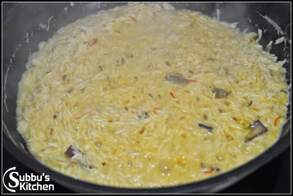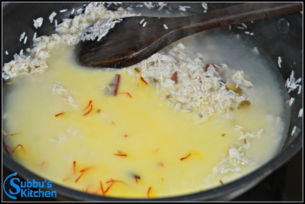 - Then add drained rice and sugar and saute it for 2 minutes. Now we are going add milk in which we have soaked the saffron thread and also water along with salt and mix well