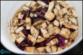 - Heat oil in a pan and add the chopped brinjal along with turmeric power and salt and saute the brinjal in oil