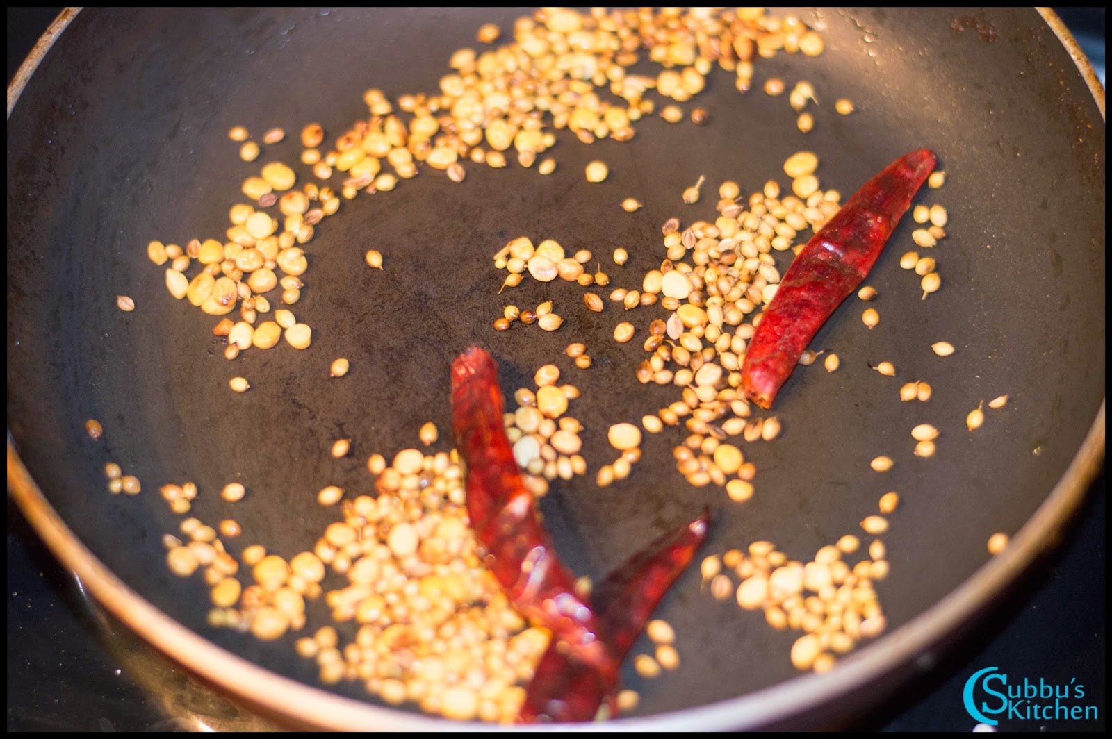 - Heat another pan and add oil. Add the grinding ingredients except coconut and fry them till the dals turn golden brown color. Take the grinding ingredients to the mixer along with grated coconut