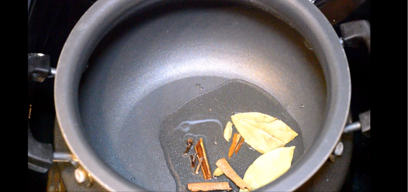 - Heat a heavy bottomed pan and add oil. Add whole garam masalas and saute them in oil. To that, add the peppercorns, slit green chillies, curry leaves and chopped ginger and saute them all till you get a nice aroma out of the masala