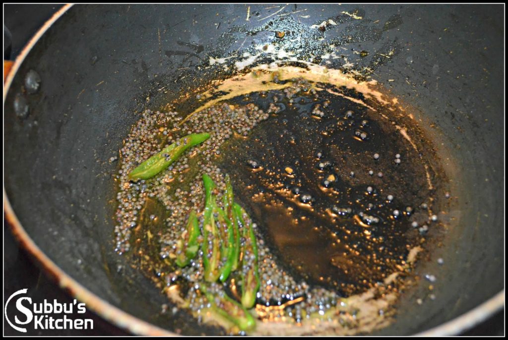 - Meanwhile , in a pan add oil and add mustard seeds and when the mustard seeds starts to sputter, add hing and slit green chillies and fry for a minute and then remove from flame. Sprinkle the seasoned ingredients on top of each dhokla pieces