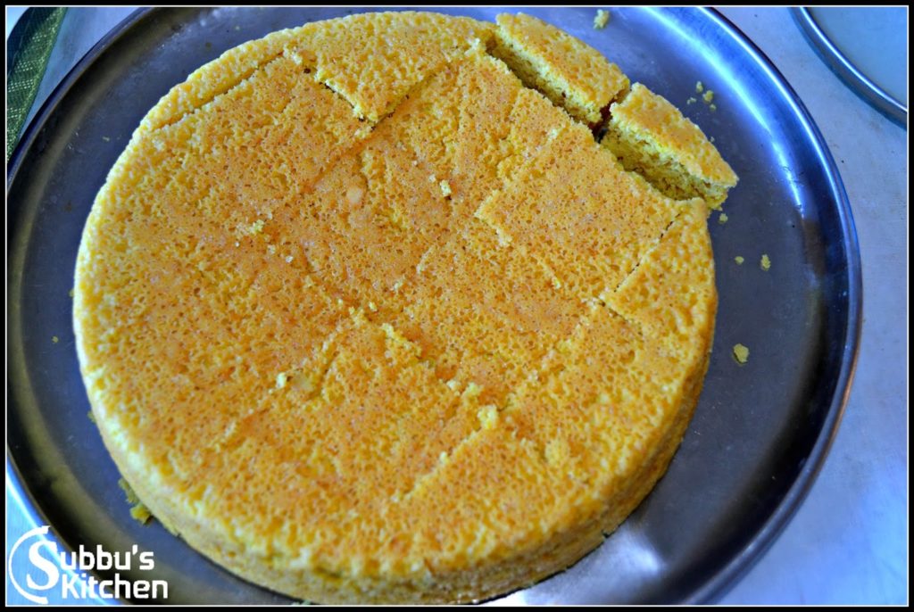 - Pour the batter in the greased vessel and gently tap it to spread the batter evenly in the vessel. Steam cook the dhokla batter for atleast 15-20 minutes. You could just insert a knife after 20 minutes, to see it it comes out clean. That will help us to know that the dhokla is cooked completely. When the dhoklas are steam cooked, take them out and allow it to cool off for 10 minutes. After 10 minutes, using a spread knife cut the dhoklas into square pieces