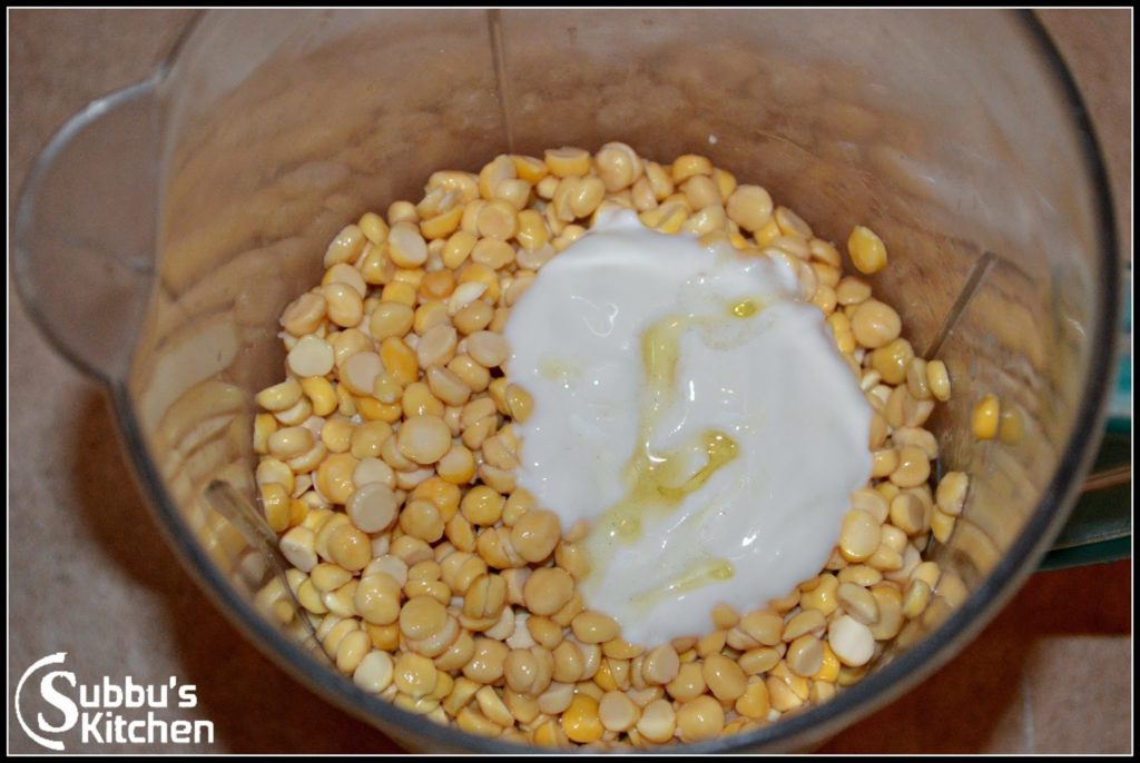 - Add 1 tablespoon of curd and 1.5 tablespoon of oil to the dal taken in the mixer. The curd and oil helps to grind the channa dal nicely in the mixer. Grind it to get a thicker and slightly coarse batter