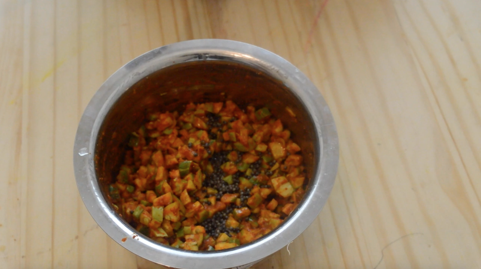 - Heat oil in a pan, add mustard seeds and allow it to sputter. Add hing and switch off the flame. Add seasoning to the kovakkai pickle.
