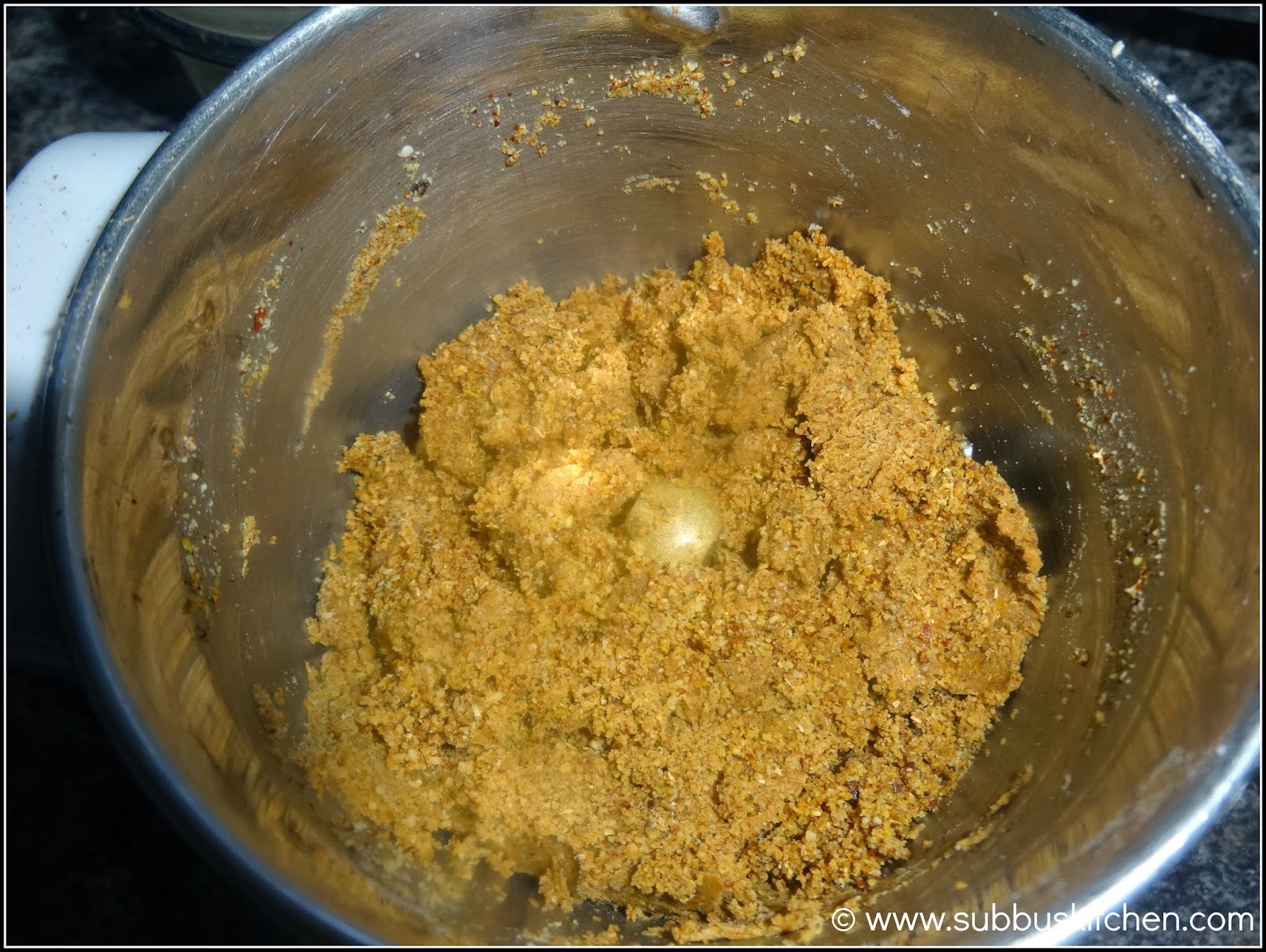 - Take the fried and cooled ingredients in a mixer and grind it to a smooth powder