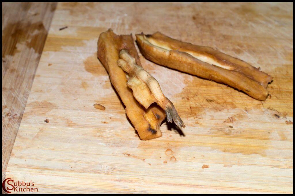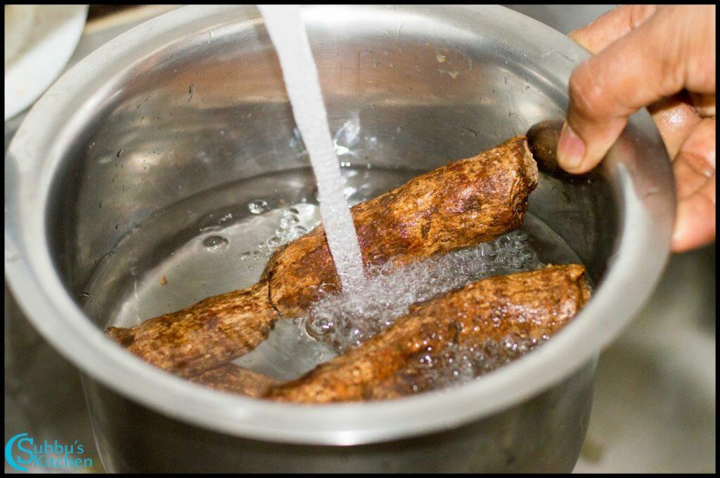- Wash the Mahali kizhagu in water. Pat dry and then slit each root vertically into halves. Take out the hard vein inside it and discard.