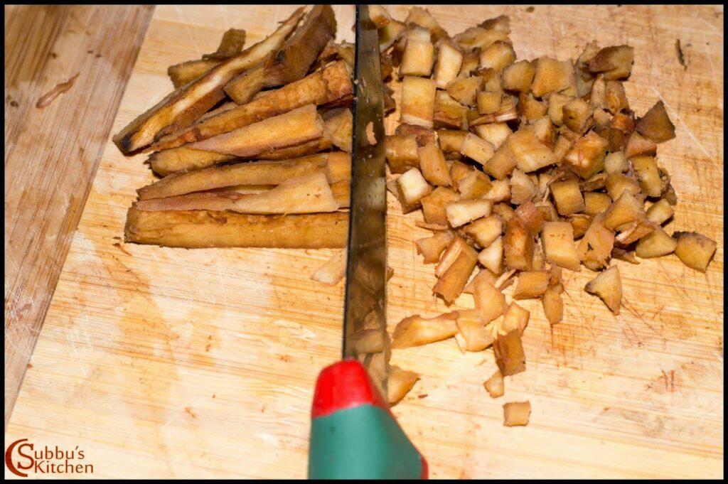 - Finely chop the root into small pieces and soak them in water till you are finished with chopping. This is to avoid de-colourisation of the root.