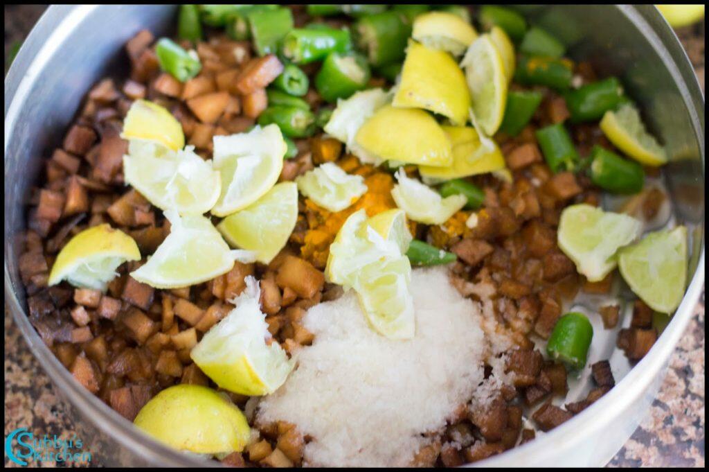 - Keep the lemon juice aside and finely chop the rest of the 4 lemons. Add the lemon bits along with lemon juice to the vessel containing chopped mahali and toss it well so the all the ingredients are mixed together nicely