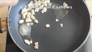 - Heat the tawa and add a teaspoon of ghee. Once the ghee is hot, toss in the cashews and cook until they turn a light golden color