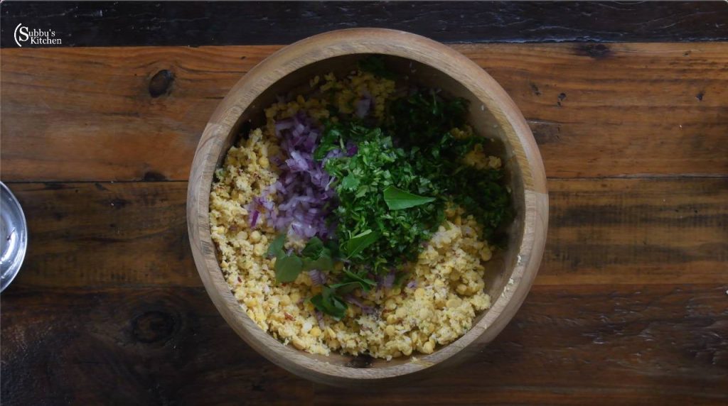 - Grind the vada mixture to coarse paste. Keep aside 1 handful of soaked dal and add it to coarsely ground vada mixture. This helps vada to be more crispy.