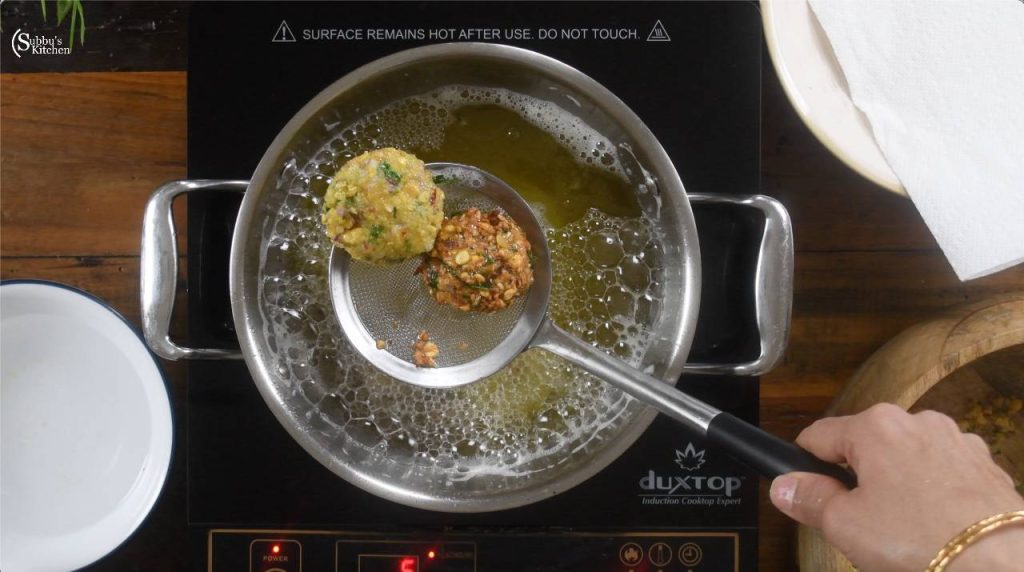 - Deep fry in low flame so the vada gets cooked nicely and becomes golden brown & crispy.