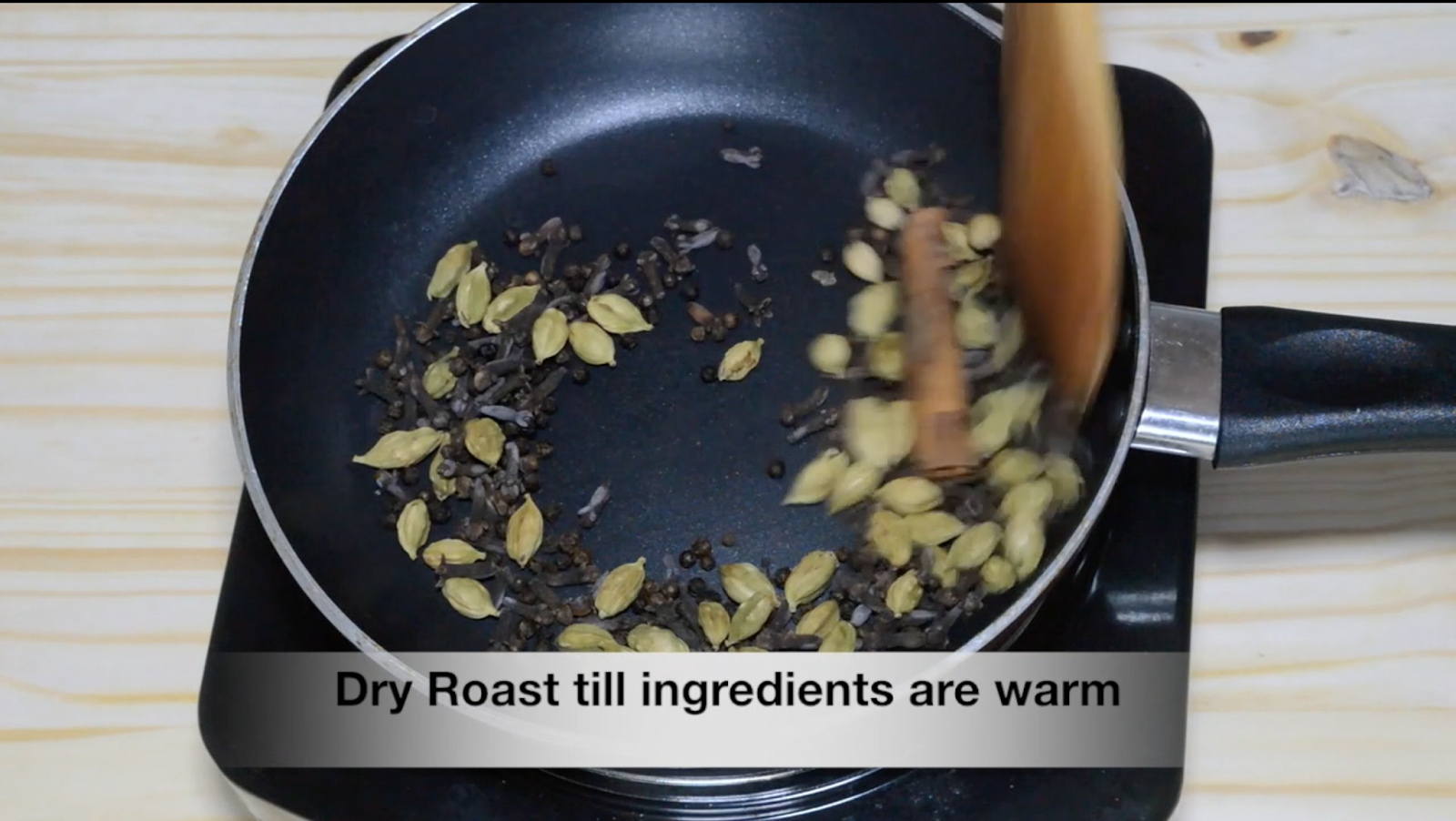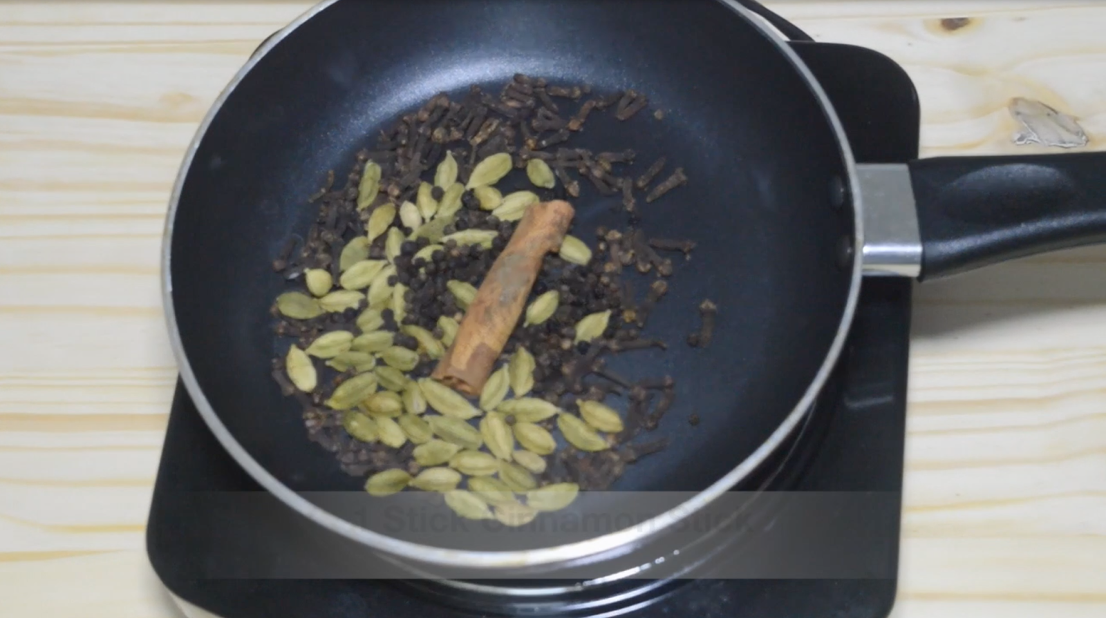 - Heat a pan and dry roast the cloves, cardamom, peppercorns and cinnamon stick till they are warm.