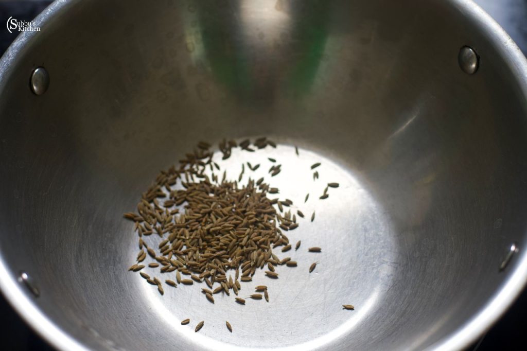 - Heat a pan. Add cumin seeds and fry till its dark brown. Take it aside in a plate.