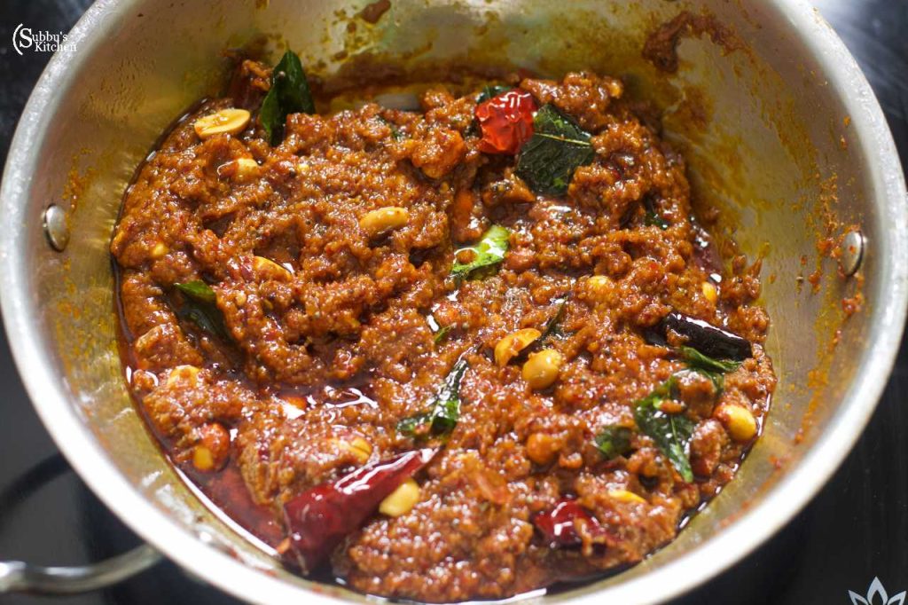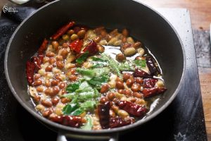 - Heat oil in a pan. Add mustard seeds and allow it to sputter. Then add asafoetida and give a mix. Next, add red chili, peanuts and fry till peanuts are slightly brown. Add few curry elaves and swtich off the flame.